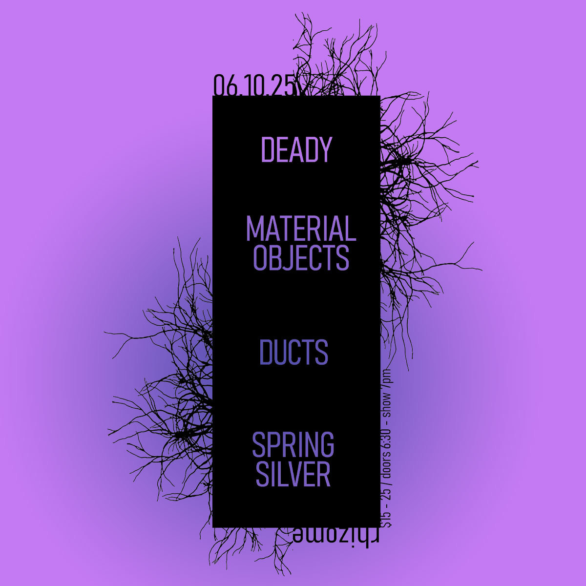 Material Objects: With a foundation of textured and rounded rhythm, dense and propulsive bass and atmospheric guitars, Material Objects exist in that sweet spot of indie rock, psychedelic and post-punk with a rich melodic edge.