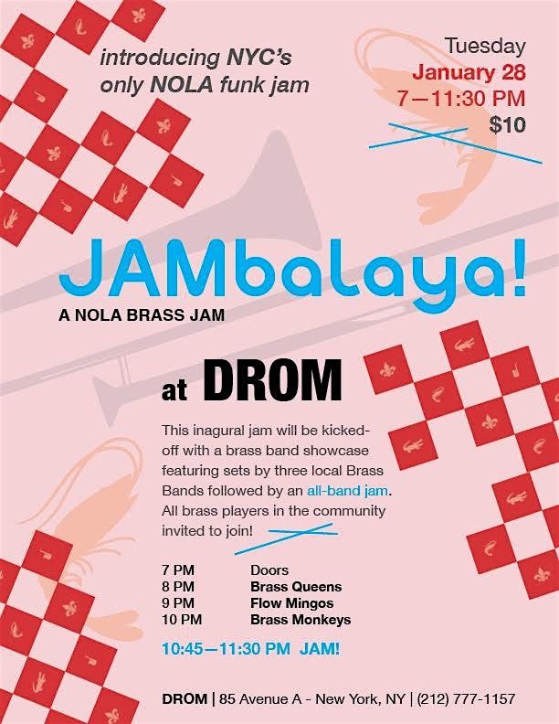 JAMbalaya! is NYC's first and only New Orleans Funk jam. This inaugural event will feature three of New York's finest brass bands and a community brass jam to end the night. All musicians welcome!