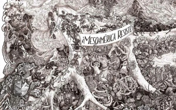 Mesoamérica Resiste is the Beehive Collective’s most recently completed narrative poster, the third and final installment in their trilogy on globalization in the Americas, and an epic project that took nine years to complete! The intricate, double-sided image documents resistance to the top-down development plans and mega-infrastructure projects that literally pave the way for resource extraction and free trade.