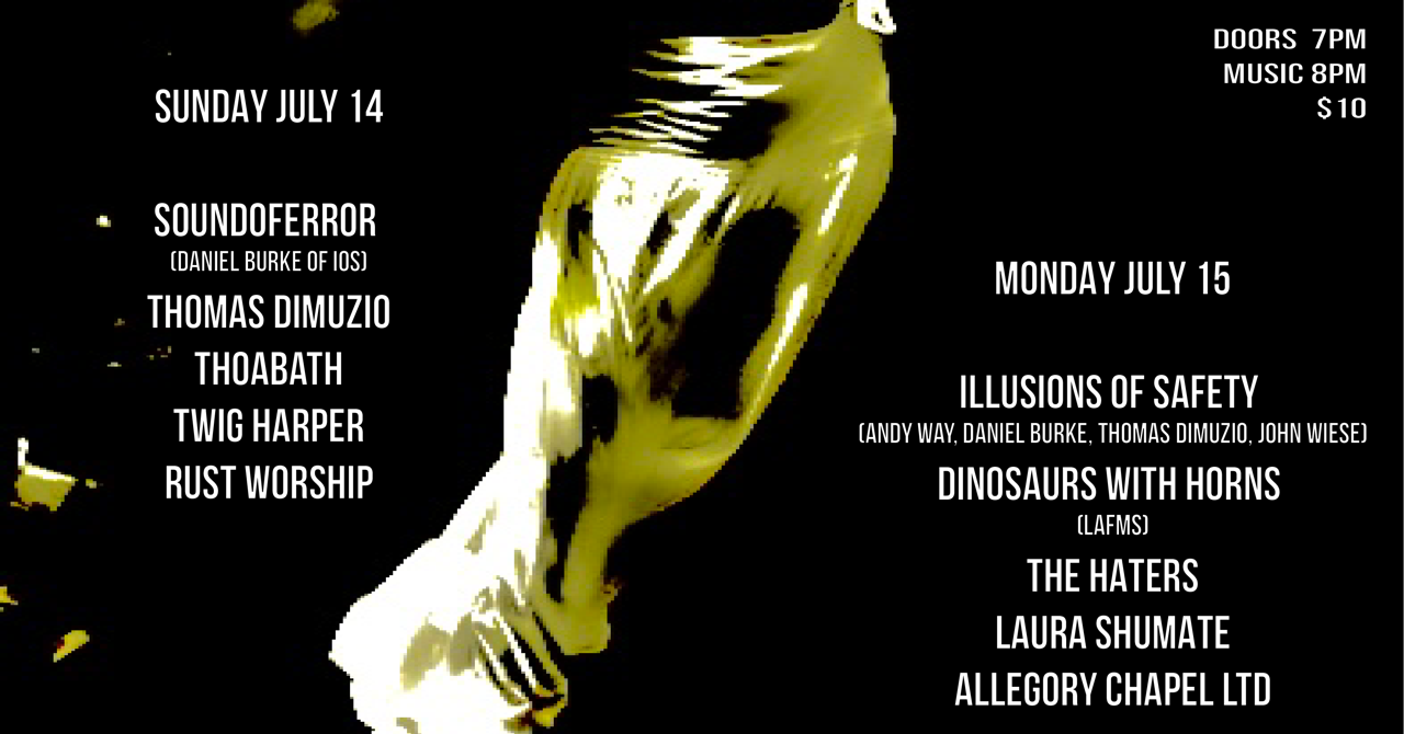 The second night will close out with a special quartet iteration of IOS called Illusions Of Safety, which will find Burke joined by longtime collaborator Thomas Dimuzio, Thoabath's Andy Way, and noise legend John Wiese. Local support will include renowned LAFMS enterprise Dinosaurs With Horns, iconic noise pioneers The Haters, modular marvel Laura Shumate, and a rare appearance from California industrial pioneers Allegory Chapel Ltd.