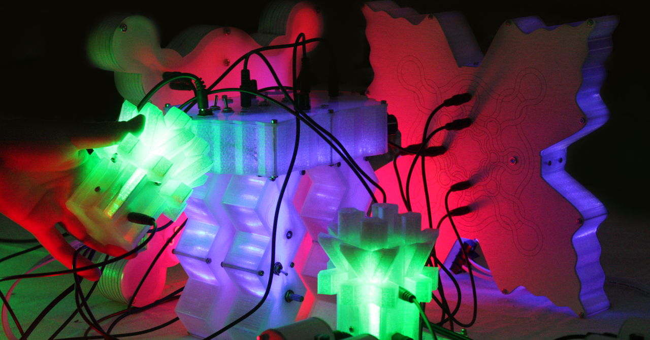 Mesh Manifold is a live sound-sculpture composition by the duo MSHR, consisting of a multitude of devices in a complex and unruly feedback system of sound and light. Developed over the course of a summer residency in Santa Cruz, California, Mesh Manifold extends MSHR’s past work, introducing a fresh population of autonomous sculptural “entities,” cohabiting across simulated and substantial substrates.