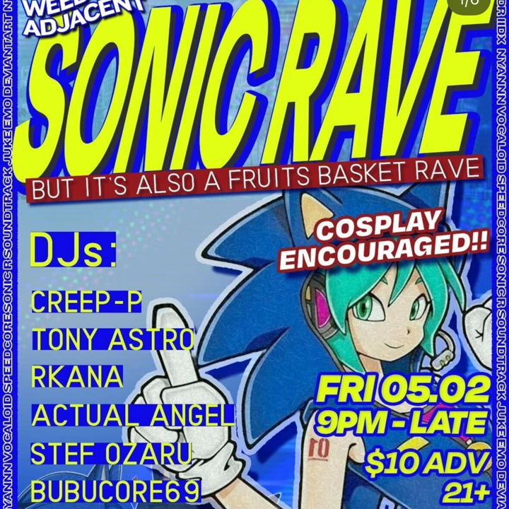 Well you're in luck!! WEEB ADJACENT, your favorite anime rave series, is back with SONIC RAVE BUT ITS ALSO A FRUITS BASKET RAVE!! Get ur chili dogs and ur animal-transforming bishies and pull up to @wondervillenyc for anime remixes and hard dance all night!! Featuring some of the best DJs on the algorithm: @itscreepp @magicmantonyastro @rkanaxo @mackincey @stef.ozaru @bubucore69!!