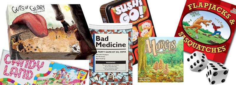Guts of Glory, Morels, Candyland, Flapjacks & Sasquatches, Bad Medicine, and Sushi Go. Thanks to Kickstarter for lending us a few copies!