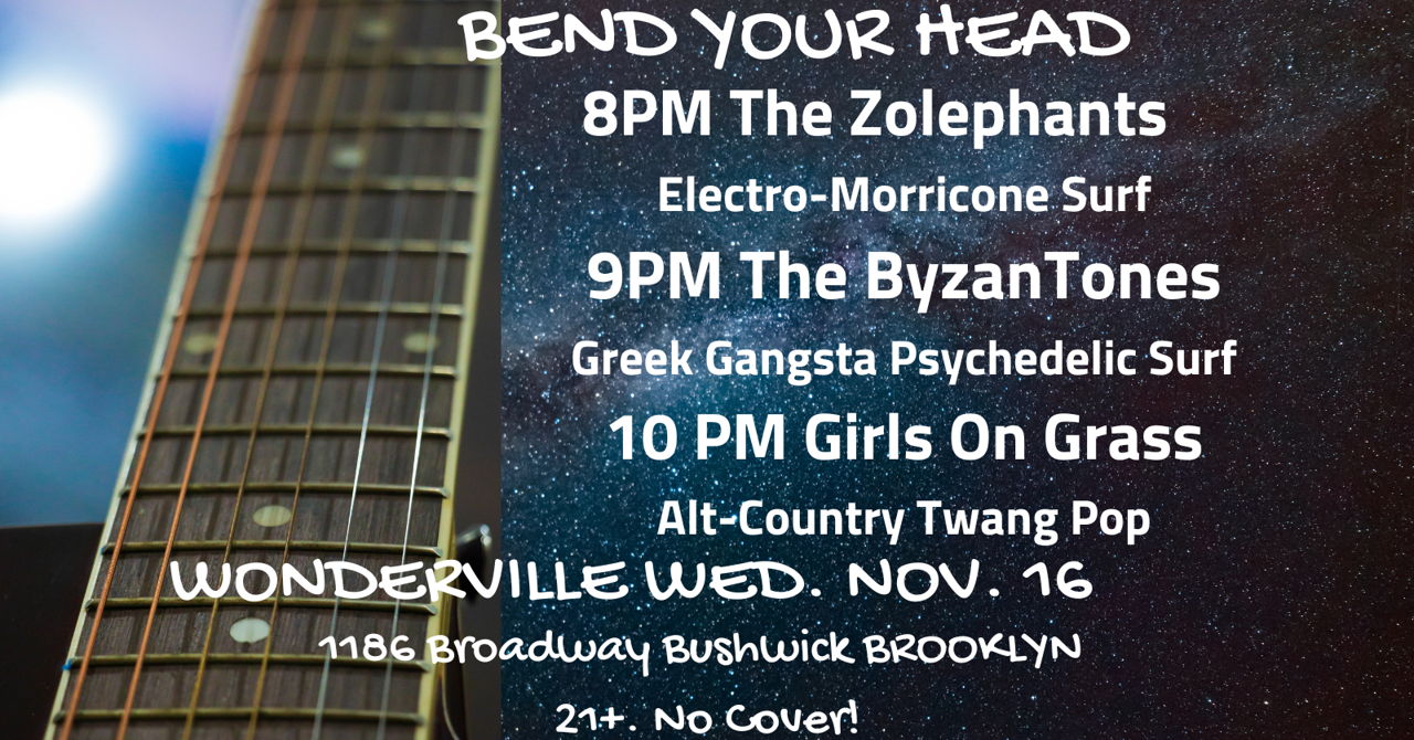 Exotic psych-surf explorers The ByzanTones with special guests Girls On Grass and The Zolephants: Three totally unique bands cook up a sonic stew of new and old twang-bar guitar-rock traditions!