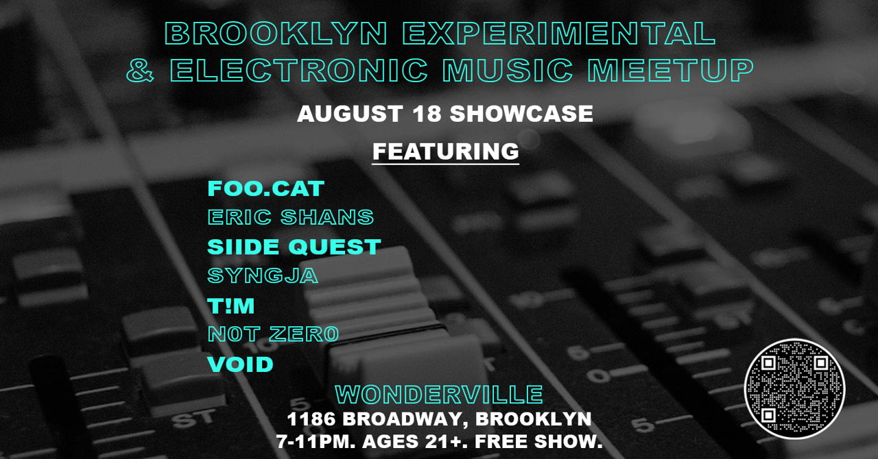 Join Wonderville's electronic music community for our August showcase featuring an eclectic mix of New York City's artists, showcasing a variety of styles and genres. This month we'll hear music from Foo Cat, Eric Shans, Siide Quest, Syngja, T!M, N0t Zer0, and Void. Organized by Metamyther and Nemesis.