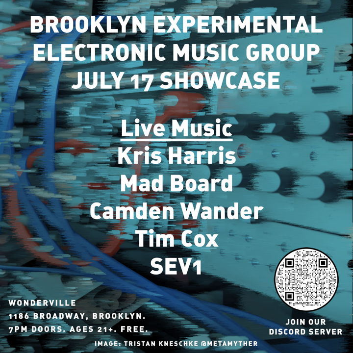Join the local electronic music community for our showcase featuring an eclectic mix of New York City artists working in a variety of styles. This month's performers: Kris Harris, Mad Board, Tim Cox, Camden Wander, and SEV1.