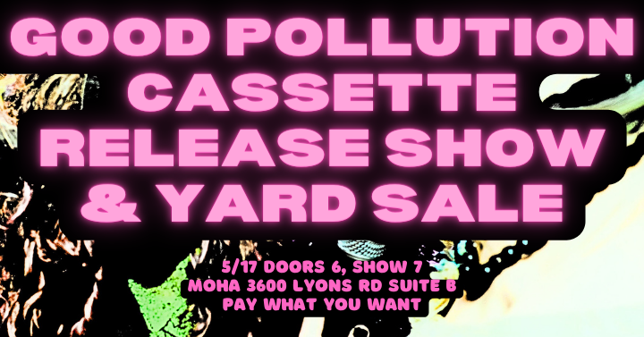 The only live brand in Austin, GOOD POLLUTION, are releasing their debut cassette before leaving Texas for Philly! Joining them will be harsh noise baddie DROMEZ, dance-inducing carnival performance artist ATTIC TED, New Orleans freak folk puppeteers COOKIE TONGUE, and beloved drag clown embarrassment artist ANDIE FLORES! There will also be a yard sale. The show is free with encouraged donations. Doors at 6:00. Show at 7:00. Sweet freaks only.