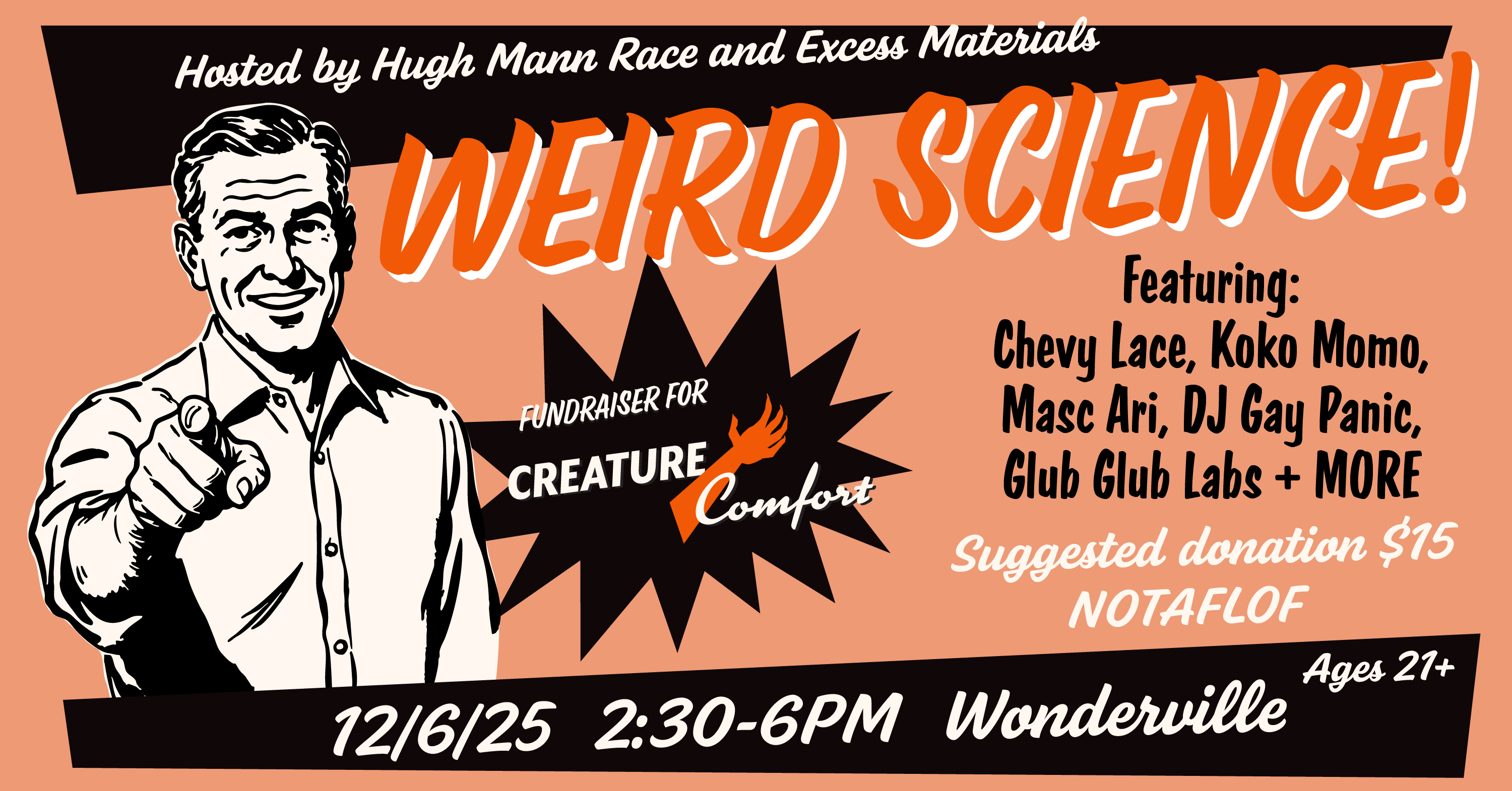 Join us for a science - themed fundraising spectacular for the upcoming musical CREATURE/COMFORT by Hugh Mann Race and Excess Materials! Featuring interactive science stations, vendors, music, drag, and tons of raffle prizes. Come party and help us raise funds for this incredible show.