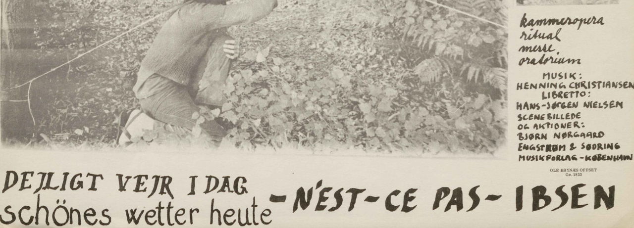“Christiansen’s opera, enigmatically titled Dejligt veer i dagga, n’est-ce pas, Ibsen? \[Beautiful weather today, n’est-ce pas (isn’t it), Ibsen?\] is perhaps the ne-plus ultra of his objectivity music. The libretto consists of a single short poem by the Danish concrete poet Hans-Jorgen Nielsen. This poem is used as the vocal material and is basically cut-up and reiterated in different ways throughout the opera. There is no plot, no action. The four singers are trapped in a circular world of no beginning or ending—the whole ethos is flat and uniform, corresponding to Christiansen’s theory of anticipation and theatrical time. As he stated, ‘I imagine music that is clear, simple and elementary in its structure—anonymous in the classical sense. A music of awareness where the formal idea is controlled by the rules of the game. Music that is controllable for the listener, in as much as the rules of the game and the idea can be directly heard.’…