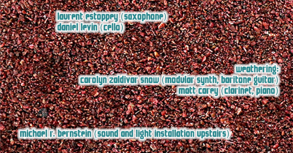 Michael R. Bernstein is a Takoma Park, MD based Composer, track-maker, and artist investigating the boundaries. He was formerly a Double Leopard, a Religious Knife, and Heavy Tapes head honcho. He will present a sound and light installation upstairs at Rhizome.
