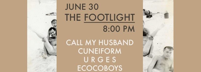 $10 AT THE DOOR • 21+ ONLY • DOORS: 8:00 pm- - -eCOCOBOYS: 8:30 pmUrges: 9:15 pmCuneiform: 10:00 pmCall My Husband: 10:45 pm- - -https://ecocoboys.bandcamp.com/https://soundcloud.com/urgesnychttps://cuneiformmusic.bandcamp.com/