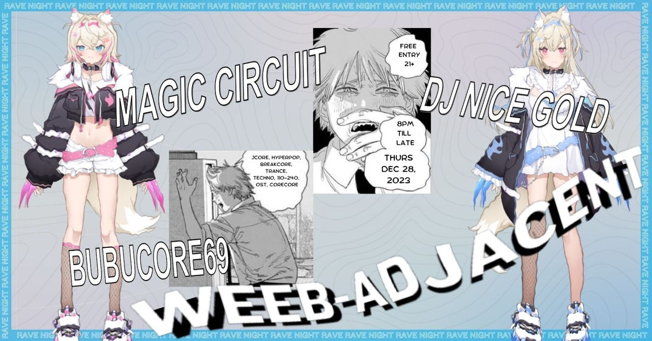 WEEB-ADJACENT returns to Wonderville for another ravey rave rave night! Pull up for j-core/happy hardcore, hyperpop, drum n bass, anisong remixes, breakcore, trance, and nightcored meme songs. Magic Circuit, BUBUCORE69, and DJ Nice Gold are dropping chooons all night. Free entry at the door!