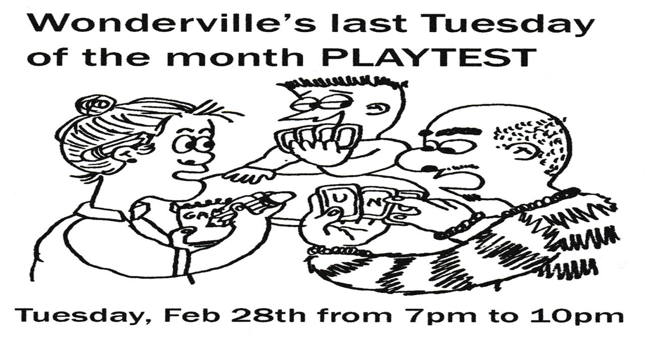 Come to Wonderville to playtest in production games!No signups required.If you're a developer, bring your game!Meet people that are apart of the New York game community!