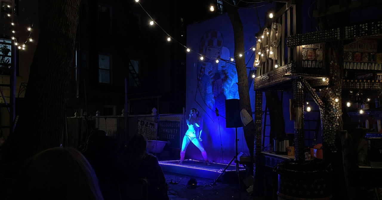 This is an outdoor show. Come prepared, no matter the weather. You're welcome to move around or head inside throughout the show. A few chairs are available scattered about but it’s mostly standing room. There’s also a picnic table for the cool kids.