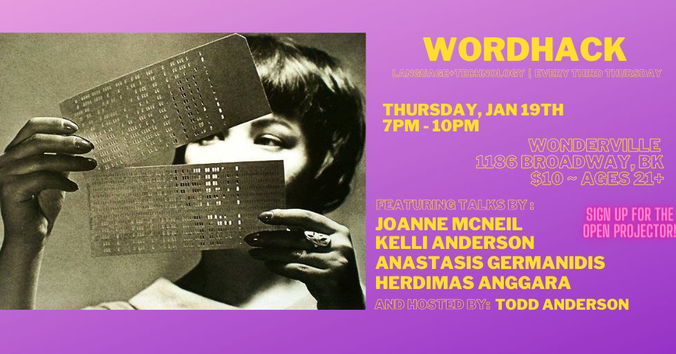 WordHack is a monthly evening of performances and talks exploring the intersection of language and technology. Code poetry, digital literature, e-lit, language games, coders interested in the creative side, writers interested in new forms writing can take, all are welcome here.