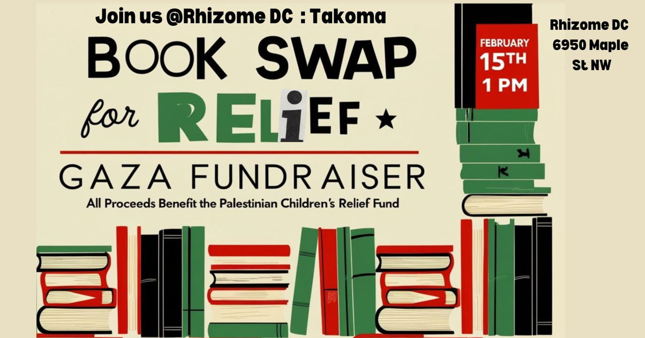 Many of us feel helpless watching Israel's genocide of the Palestinian people from afar. We are coming together in community and solidarity at Rhizome DC to raise funds for the Palestinian Children's Relief Fund (PCRF). PCRF delivers free, life-saving medical care, humanitarian relief, and other crucial services to kids both within Gaza and those displaced by genocide.