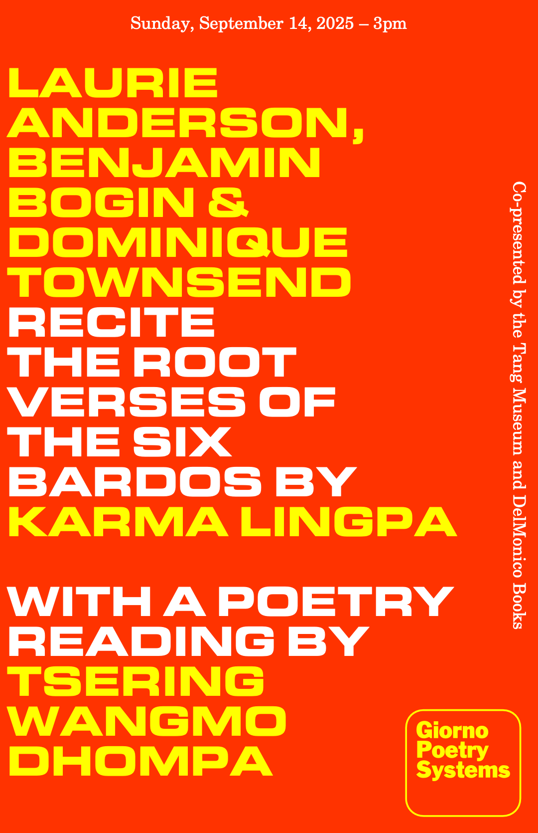 Laurie Anderson has been a student of Tibetan Buddhism and meditation for over fifty years. In 2020, she collaborated with Buddhist scholars Benjamin Bogin and Dominique Townsend on a new translation of "The Root Verses of the Six Bardos," a 14th century text revealed by Buddhist tertön Karma Lingpa. They read their translation, titled “Between Birth and Death and Death and Rebirth,” with musical accompaniment by Laurie.