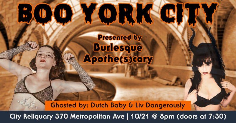 Let Dutch Baby and Liv Dangerously be your ghost hosts for the evening while they take you on a spooky, sexy tour through haunted New York. Presented by Burlesque Apothe(s)cary. Come for the boobs, stay for the boos!
