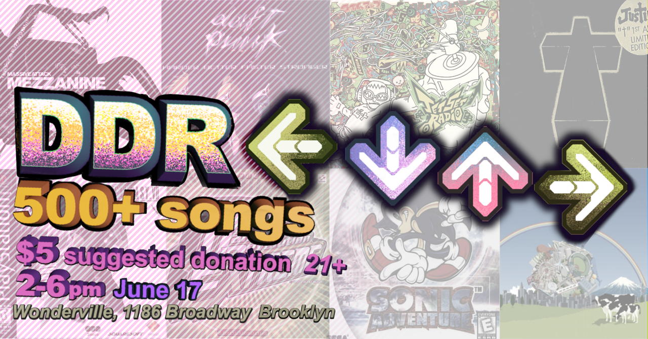 DDR, that dancing video game. We have 500 songs, including Daft Punk, Jet Set Radio, Massive Attack, Sega, Justice, Sonic, Deadmau5, MGMT, LCD Soundsystem, and the GTA Vice City soundtrack--plus Classic PS2 and Xbox DDR songs. Beginners and Experts welcome (and can play simultaneously). We'll be there from 2 in the afternoon to just before the night event.