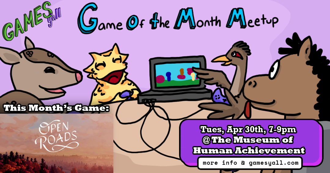 Games Y’all is a monthly meetup presented by the Museum of Human Achievement for indie devs, digital artists, and games fans.