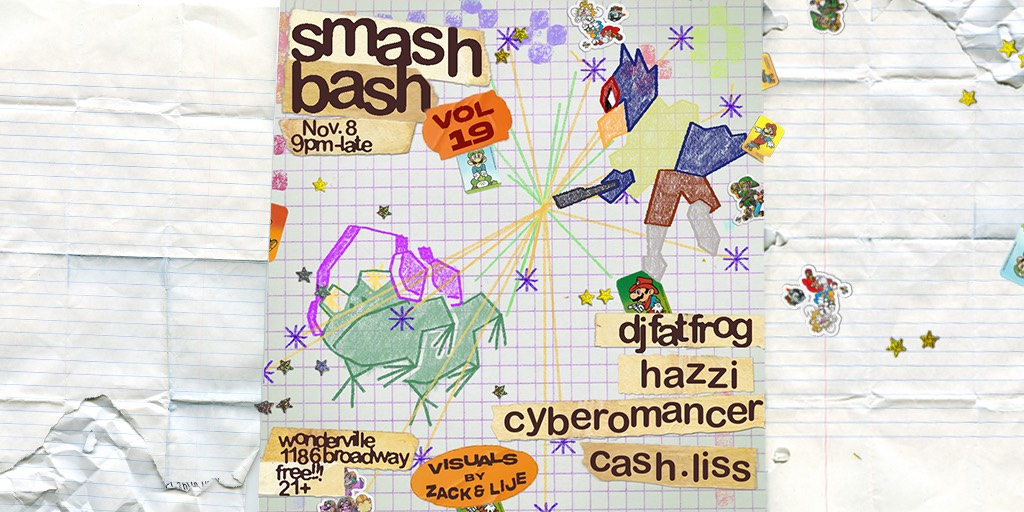 Smash Bash brings the ultimate mash-up of tourney and tunes once more, as volume 19 brings an exciting lineup of DJs (including one of Wonderville's bartenders!) to accompany the Smash Ultimate tourney, spinning house, juke, jungle, club, VGM, and more!
