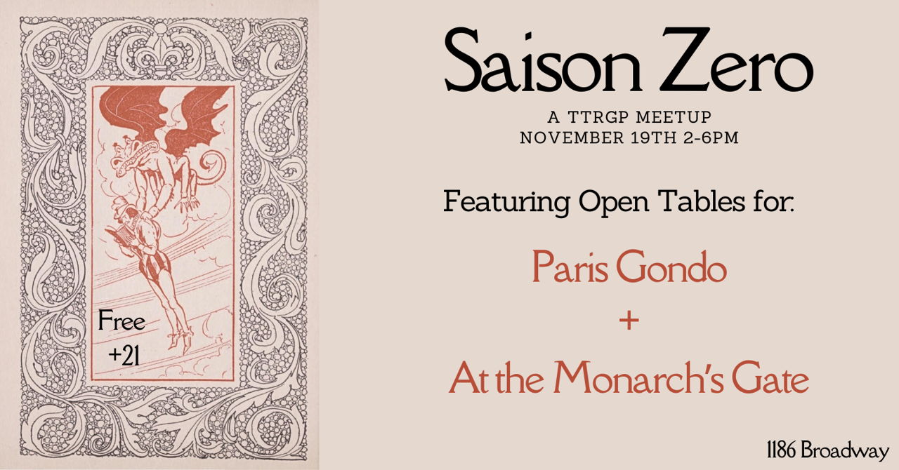 Your friendly neighborhood TTRPG Meetup is Back! Saison Zero is a monthly tabletop role play game meetup dedicated to introducing folks to games other than just D&D. Light on rules, rich in flavor. This month we're holding open tables for two wonderful systems: Paris Gondo and At the Monarch’s Gate