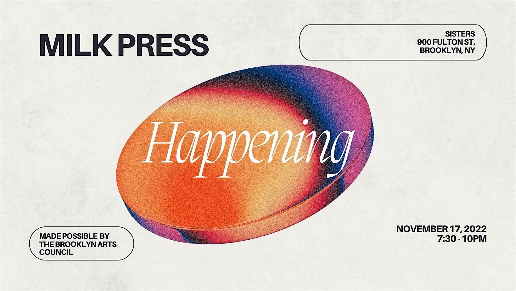 Milk Press Happenings is an event series designed to generate artistic collaborations. Each event invites creators of all mediums to come and create new work spontaneously and in dialogue with one another—consider this a space to generate new work.