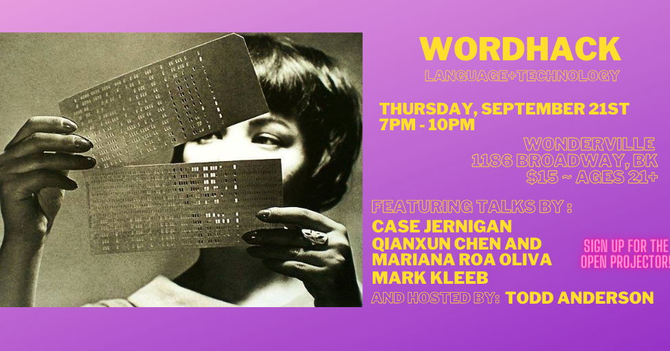 WordHack is a monthly evening of performances and talks exploring the intersection of language and technology. Code poetry, digital literature, e-lit, language games, coders interested in the creative side, writers interested in new forms writing can take, all are welcome here.