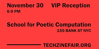 If you are interested in supporting us, we kindly ask if you can purchase a sponsor ticket ($100) that will cover food and drink, provide you entry to a night of interesting art and discussion, and will go towards supporting the vision and work of the New York Tech Zine Fair. VIP reception is an opportunity for our community members and sponsors to have a first look at the zines, meet the vendors and visit the zine fair. All profit from the event will be used to support vendors and workshop organizers.