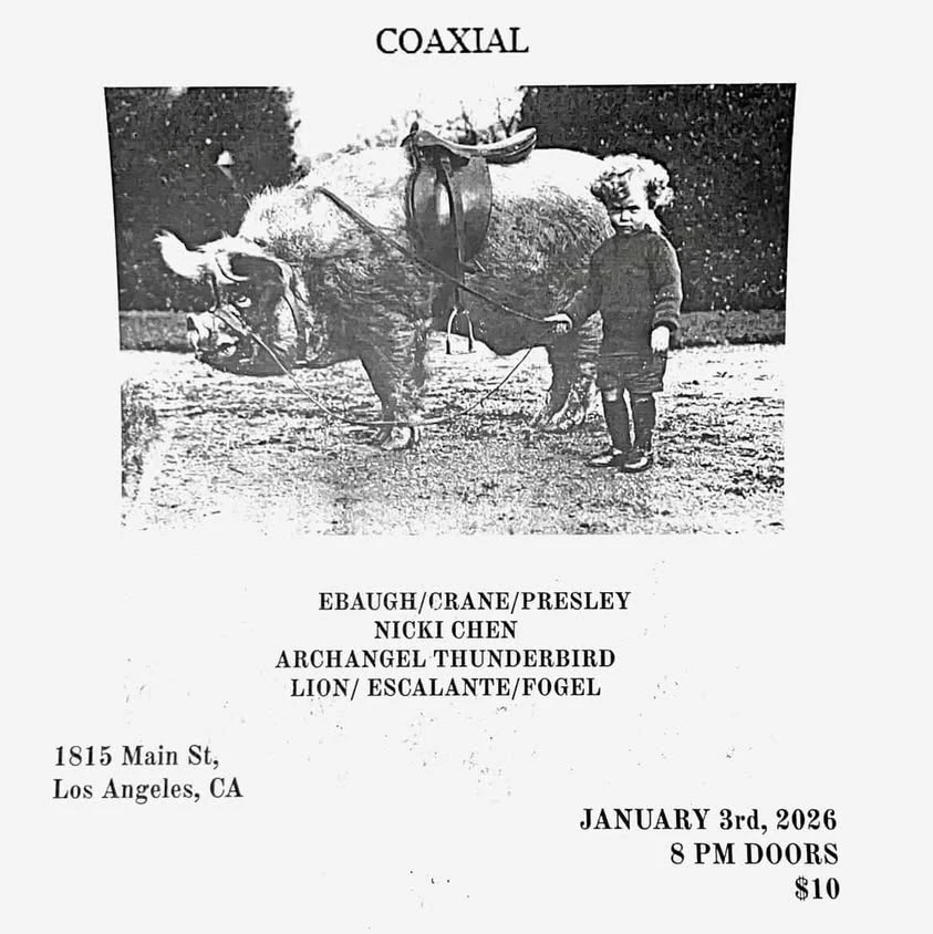 Kick off 2026 at Coaxial with some of So Cal improv's best and brightest. Featuring the debut of the Ryan Ebaugh/Matt Crane/Cameron Presley trio, a solo performance from Nicki Chen, the massive supergroup Archangel Thunderbird led by Bennett Koss (and named after maybe the most iconic Amon Düül II jam), and a trio of Adam Lion, Martín Escalante, and Corey Fogel.