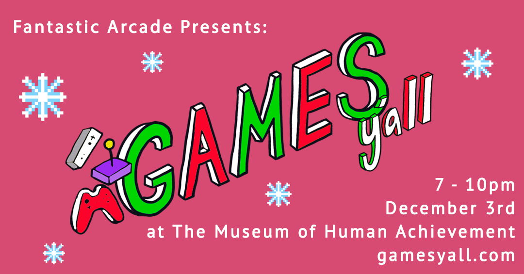Games Yโall is a meetup presented by Fantastic Arcade & The Museum of Human Achievement, held every month at venues around Austin for indie devs, digital artists, and games fans.