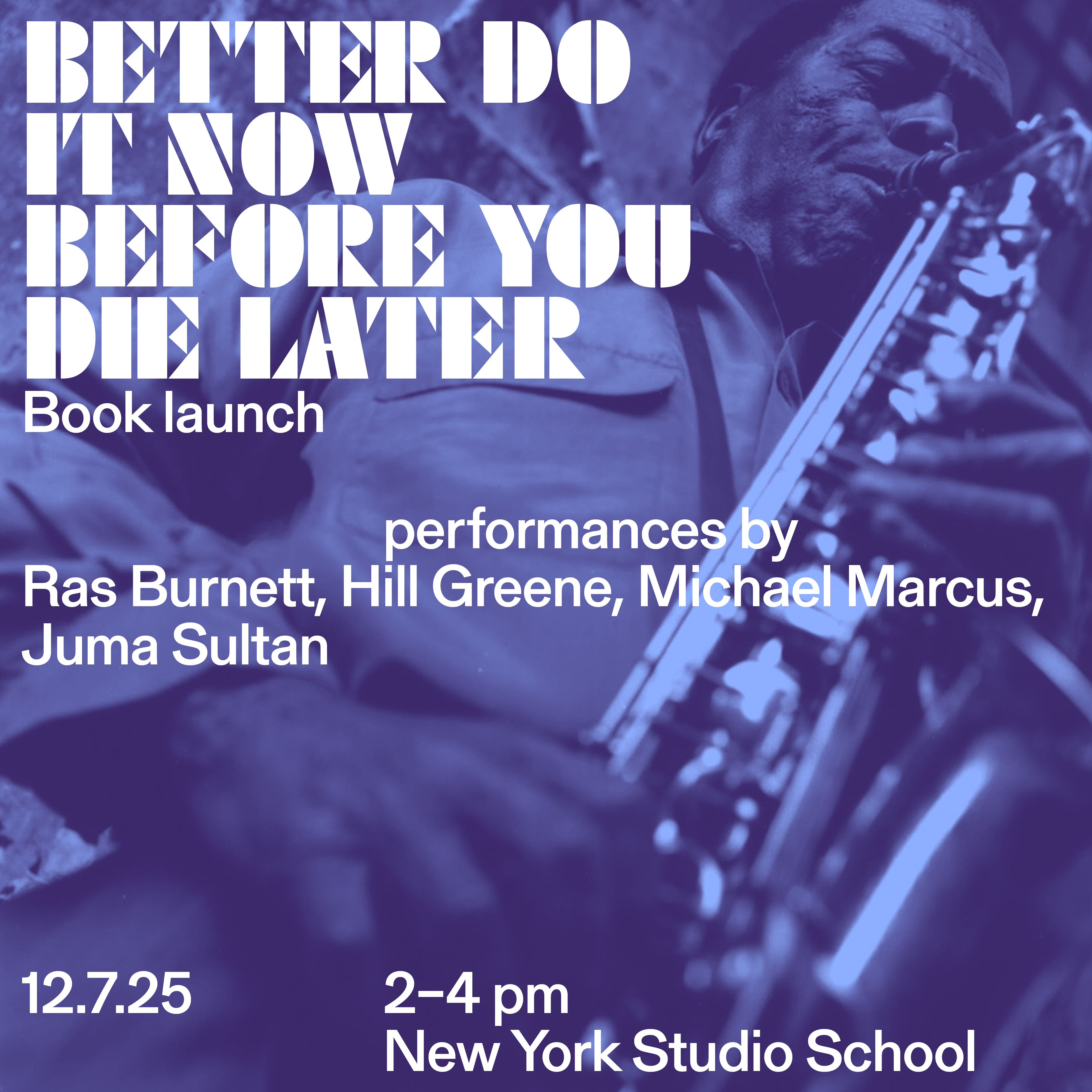 To celebrate the release of Better Do It Now Before You Die Later, the memoir of American saxophonist Sonny Simmons, Blank Forms brings together four essential players of the New York free jazz scene: Ras Burnett, Hill Greene, Michael Marcus, and Juma Sultan. As multi-instrumentalists, composers, educators, and community organizers, all four of these musicians have worked to ensure the continued vitality of this city’s avant-garde jazz practices and institutions. Their careers span Harlem lounges and downtown lofts, as well as countless Black musical traditions, from reggae to Christian spirituals to orchestral arrangements to harp blues. Whether they have shared stages, recording studios, or simply friends and influences with Simmons, each member of this quartet is tightly interwoven with the musical community Simmons commemorates in Better Do It Now Before You Die Later.