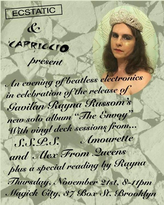 Ecstatic and Capriccio present an evening of beatless electronics in celebration of the release of Gavilán Rayna Russom’s new LP “The Envoy”. With vinyl deck sessions from S.S.P.S., Amourette and Alex from Queens. Plus a special reading by Rayna.