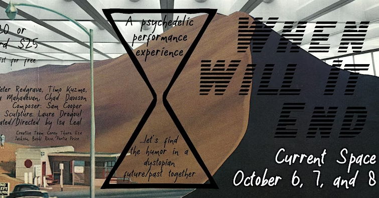 Synopsis: When Will it End (Reboot): is an immersive psychedelic performance experience that queers a classic post-apocalyptic play, provides a space to find the humor of our collective trauma and does work. This full length evening has developed through divination with voices across diasporas and contexts….be an active audience, Oct 6-8, Current Space (outside) for the action.