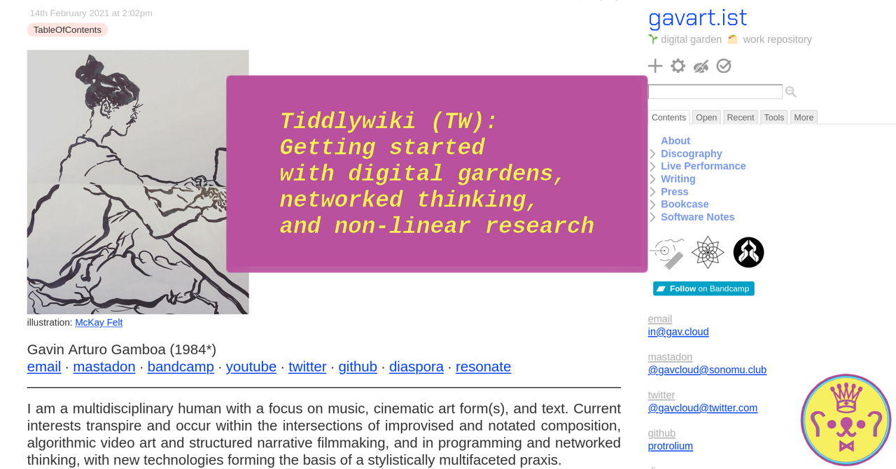 In this workshop, composer Gavin Gamboa teaches you how to set up your own personal wiki as a digital garden. Using beginner-friendly free and open source software TiddlyWiki, Gavin will demonstrate examples of digital gardens, how to use one for non-linear research, and the steps to set one up.