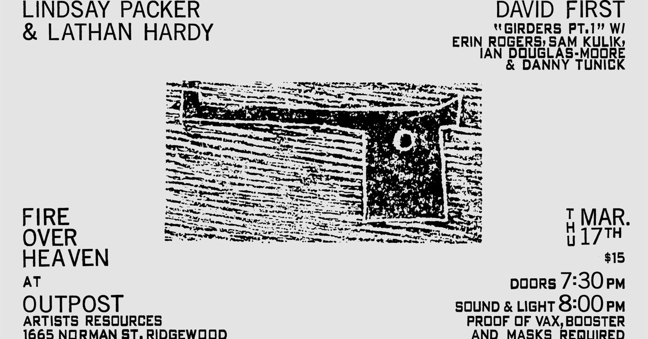 This month's edition of Fire Over Heaven will be a special A/V presentation featuring sound and light works by Lindsay Packer & Lathan Hardy and a new ensemble piece by FOH perennial David First. Lindsay Packer's work moves through the codes of filmmaking, architecture and the analog/digital spectrum with an improviser's sensibility. Often drawing musicians and sound artists into dialogue with her real-time color/light/projection structures, she's collaborated with FOH alum Anaïs Maviel and experimental electronics duo Fan Letters. Here she'll be presenting a new iteration of her Viewfinders project with saxophonist and composer Lathan Hardy, who some FOH fans may remember from his work with the George Steeltoe Ensemble or collaborations with Sean Ali and Flin van Hemmen...David First will present a new piece entitled "Girders pt.1" which he describes as "an audio/visual exploration of just intonation and its ill-tempered opposites'', featuring members of his The Western Enisphere--Sam Kulik, Ian Douglas-Moore, and Danny Tunick--with special guest Erin Rogers. David First's fascinating career has stretched from playing in Cecil Taylor's large ensembles at the age of twenty to his late 70s noise punk band The Notekillers, on to a series of focused explorations of electronic music and instruments ranging from harmonica to sitar, which somehow bring us to his recent ensemble meditations on the inherent messiness of intonation and the ecstatic nature of long durations. A great night for the eyes and ears.