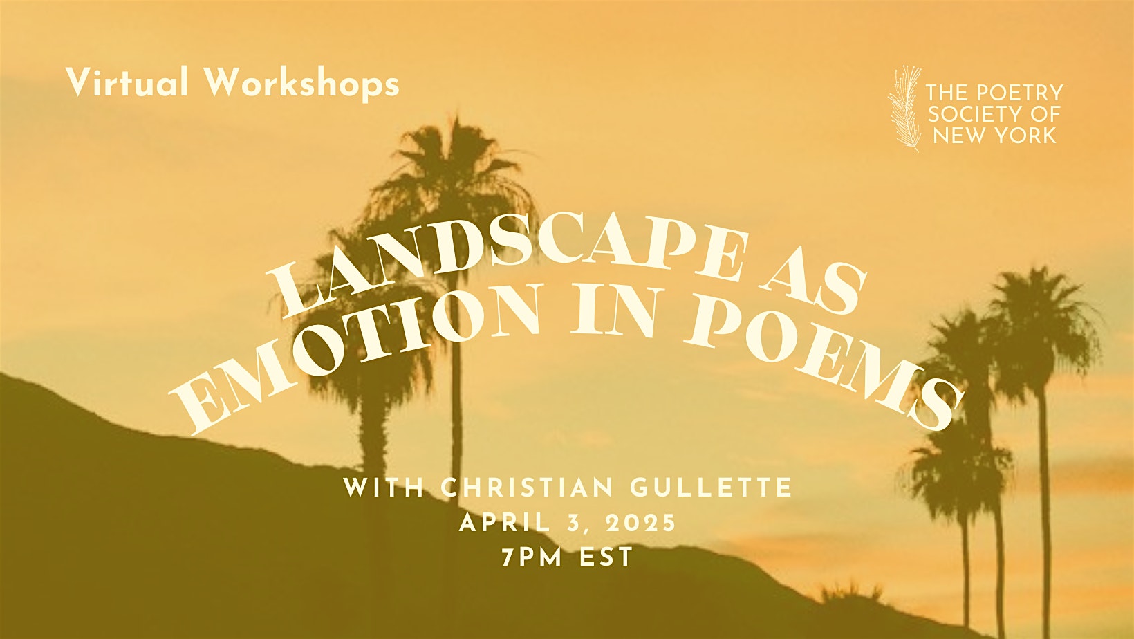 Place or landscape in a poem can amplify powerful interior feelings, using image and diction and details of the world to raise the emotional stakes. Whether ecological, urban, or the landscape of a hospital room, garden, office or highway, various landscapes can serve not merely as background in a poem but reflect a speaker’s interior emotions such as desire, grief, joy, or erotic longing. These landscapes can even loom so large that they almost become characters or figures in their own right, both amplifying and resisting a speaker’s concerns. We’ll take a look at poems by poets such as C. P. Cavafy, K. Iver, Randall Mann, Aria Aber, Tomas Tranströmer, Diane Seuss, Lena Khalaf Tuffaha, Elizabeth Bishop, Carl Phillips, Natalie Shapero, Issam Zineh, Natalie Diaz, Rachel Mannheimer, Alice Oswald, Boris Dralyuk, and James Longenbach. explore the range of different possible ways poems feature landscapes as vehicles for emotion, then use the time to generate and share writing inspired by this exterior – interior relationship in our poems.