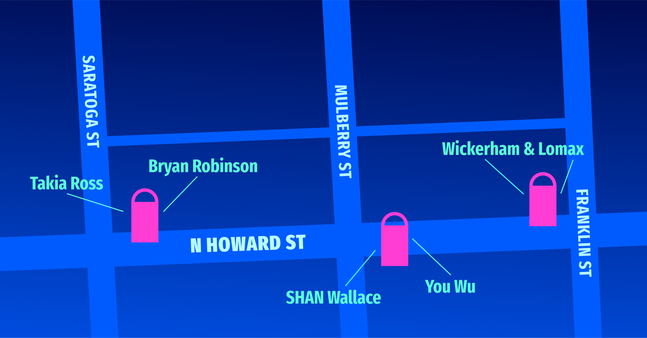 View the works in person along Howard Street with a self-guided tour and enjoy refreshments and an artist talk in the gallery at Current Space (421 N Howard Street).