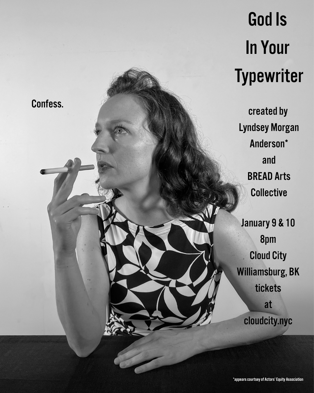GOD IS IN YOUR TYPEWRITER is an Equity approved showcase, and Lyndsey Morgan Anderson appears with permission of Actors’ Equity Association without benefit of an Equity contract in this Off-off Broadway production.