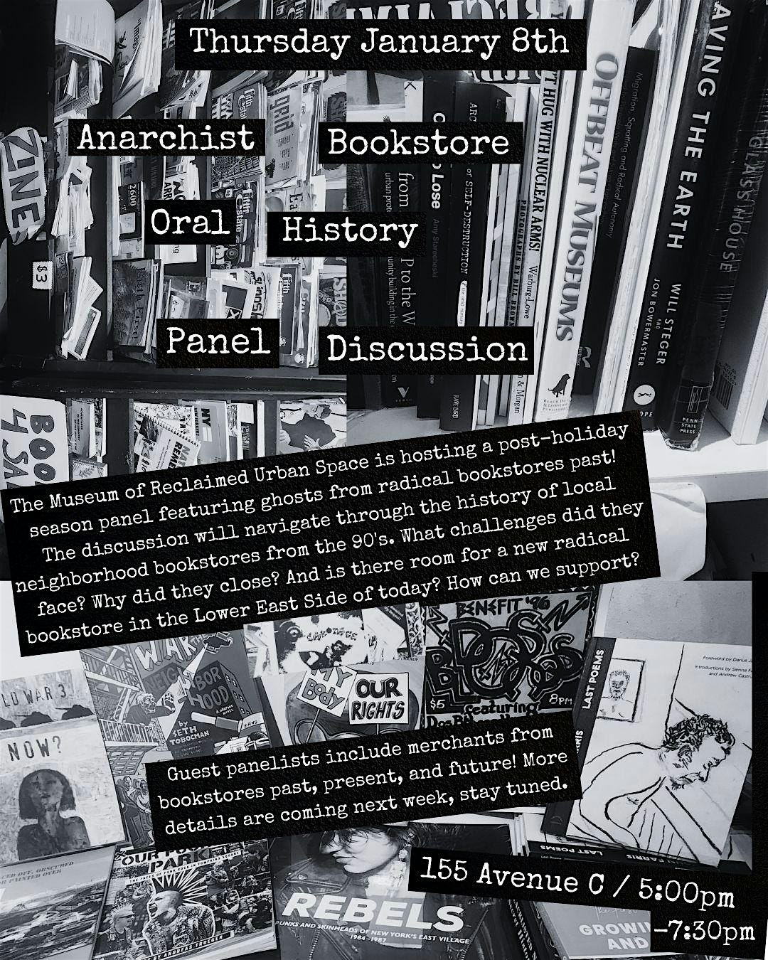 Join us for a panel on January 8th at the museum from 5-7:30 about anarchist bookstore & environmental activism oral history! 155 Avenue C.
