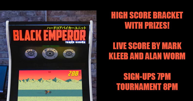 The sky is orange so we’re hosting a tournament for our favorite post-apocalyptic motorcycle game Black Emperor! There will be a high score bracket starting at 8pm featuring a live score by Wonderville staff Mark Kleeb and Alan Worm.