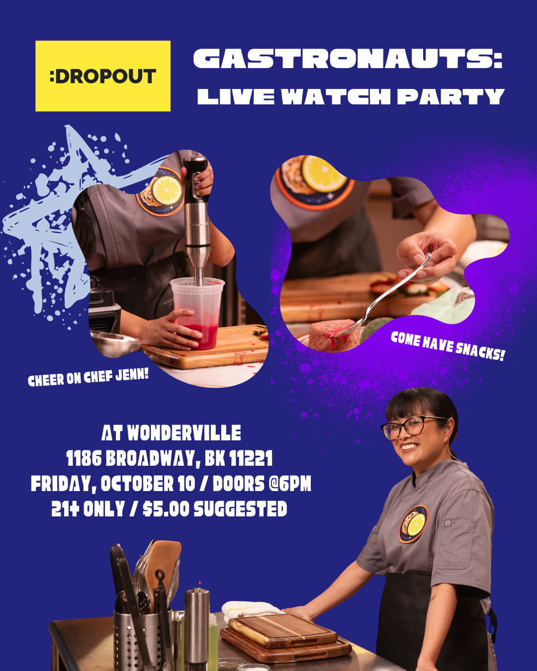 About the show: Hosted by Jordan Myrick, 3 Gastronauts (chefs) are challenged by 3 Asteroids (comedians) to make the most unhinged, most ridiculous, and most unexpected foods in 30 minutes. The winner receives an actual, literal piece of the moon.
