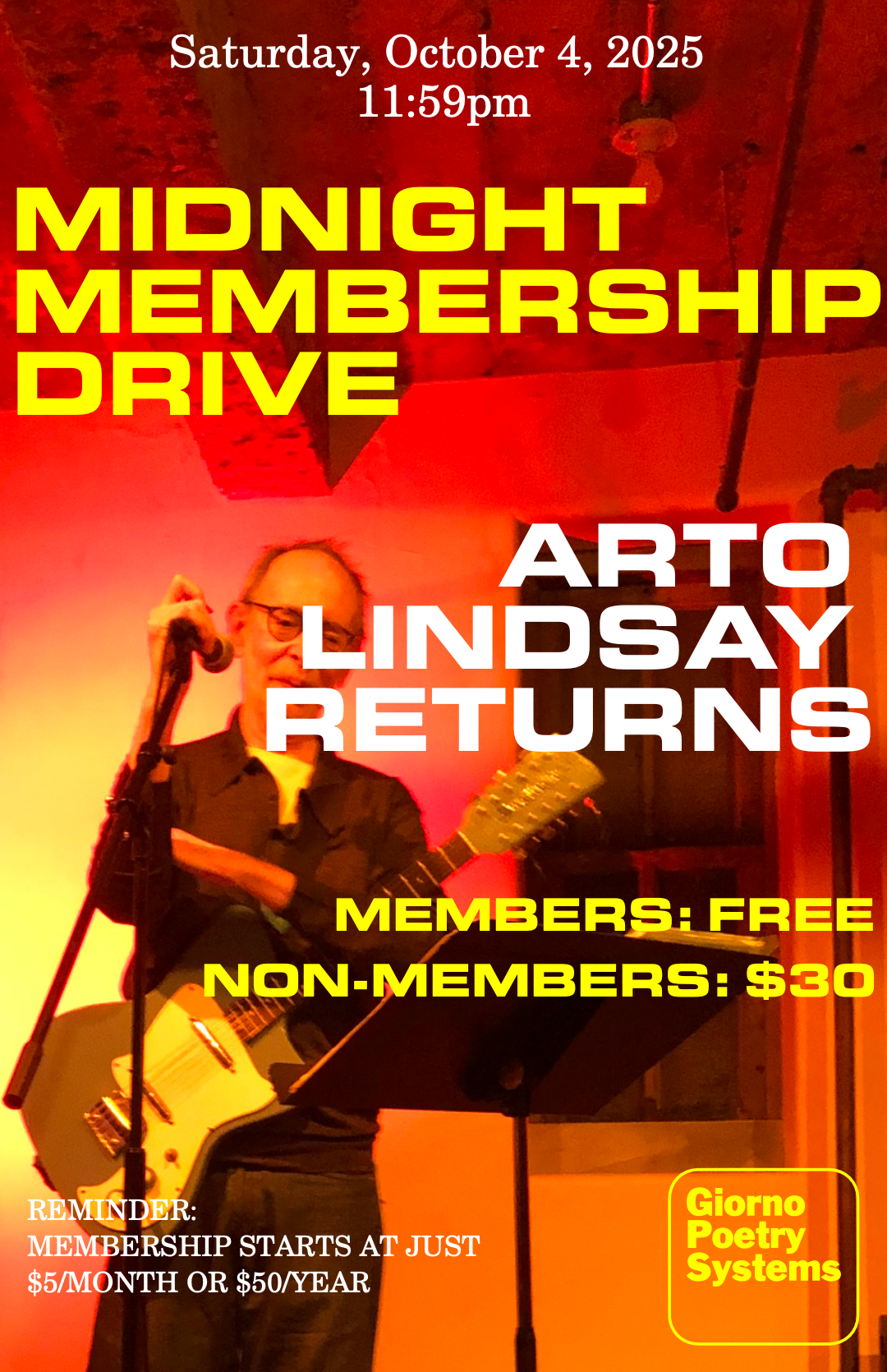 Last fall, Arto Lindsay invited Melvin Gibbs to talk about the book he’s writing and to perform a live duo set. It was a memorable evening for all who were there. Now, Arto returns to 222 for a special membership drive event—and he had an idea that would make the concert quite special: a midnight show.