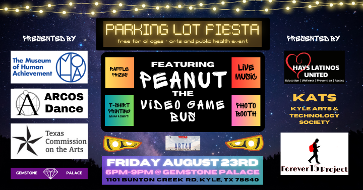 The Museum of Human Achievement (MoHA) is bringing a community art party to Kyle to mark the end of summer break! Our extra special guest, “Peanut”, is a retrofitted 90s city bus that brings accessible activations like film screenings, art installations and more. This time, Peanut will transform into an arcade bus featuring some exciting Indie Games. In addition we will be hosting local teen musicians and artists from Kyle for musical performances, along with the Austin-based dance group ARCOS.