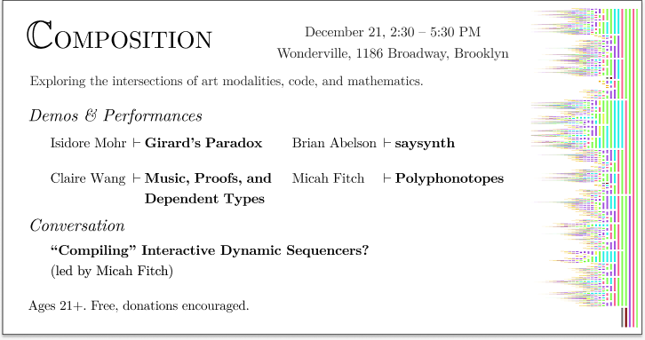 Micah Fitch (https://wondering.xyz) - Polyphonotypes: A theoretical framework and tools for mapping and understanding relationships between pitch-class sets. Think *circle of fifths meets graph theory* and then they discover that they're both interested in learning more about monoidal categories (surprise!).