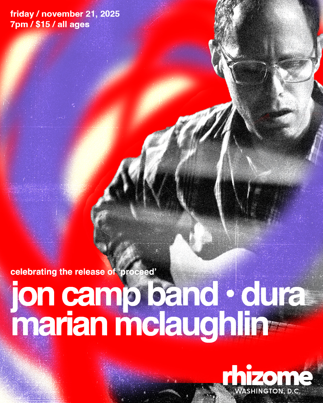 Jon Camp is a fingerstyle guitarist and composer based out of the DC region. Jon blends melody, twang, and drone into a cohesive whole that is exploratory without forsaking the hook. Jon will be celebrating his new record, Proceed, out October 17th through Centripetal Force Records. Proceed is a full-band affair that is electric, expansive, and emotionally muscular, channeling a spirit of forward motion amidst the weight of memory and uncertainty. For Jon's Rhizome set, he'll be joined by regular collaborators Dave Jones (The Caribbean), Julian Comanda (Visitors), Scott Verrastro (Kohoutek, Jeffrey Alexander & The Heavy Lidders), and some guests.