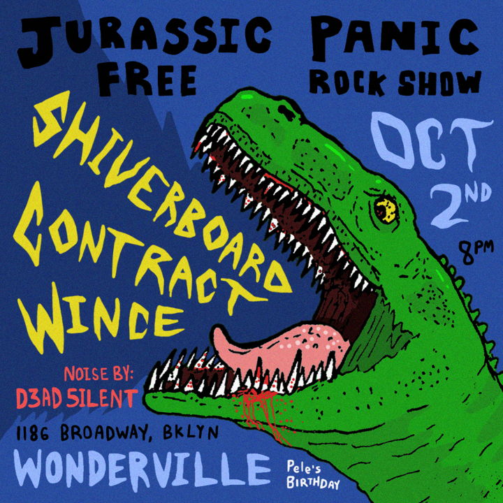 Noise rock industrial & electronic hardcore clash in this cant-miss event. WINCE, CONTRACT & SHIVERBOARD perform together under the Jurassic moon, while all manor of carnivores and prehistoric fauna loom in the background. With electronic noise by D3AD 5ILENT.