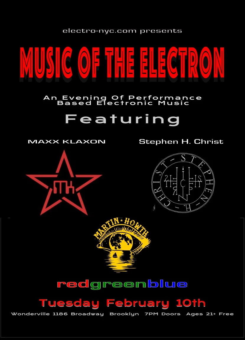 Join the electronic music community for a performance based mix of New York Area artists using modern tools to make timeless music. This evening’s performers: Steven H. Christ @stephenhchrist. Maxx Klaxon https://linktr.ee/maxxklaxon, Martin Howth https://linktr.ee/martinhowth and redgreenblue https://linktr.ee/redgreenbluergb