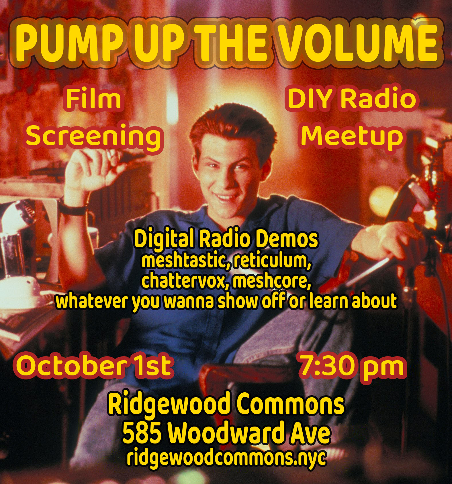 Join us Wednesday, October 1st for a screening of Allan Moyle’s punk pirate radio classic, “Pump Up The Volume” (1990), followed by demos of modern DIY radio tools from RC's own Technical Collective (aka Basement).