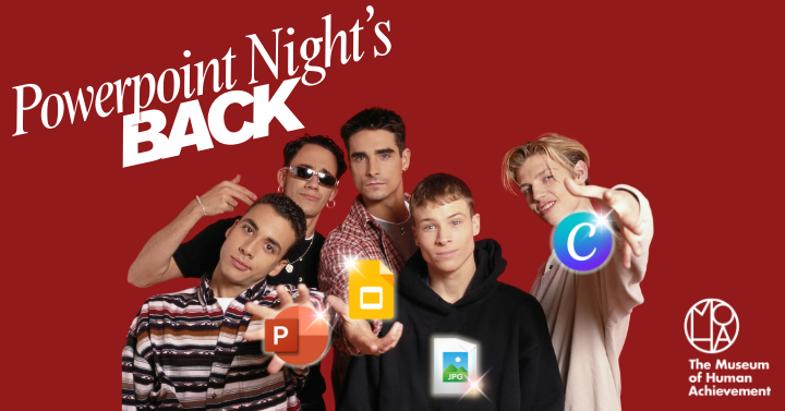 On Wednesday, October 8th The Museum of Human Achievement will present its 4th festival of powerpoint lectures and/or performances. Each 5 minute presentation will, in some way, address the Backstreet Boys’ 4 essential questions listed above. Quit playing games (with my heart) and pull up a lawn chair so we can all laugh, love, learn together. Doors are at 7pm!